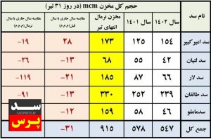 حجم مخزن نرمال سدهای پنجگانه تهران تا انتهای تیرماه میبایست ۹۱۵ میلیون مترمکعب باشد که مقایسه حجم مخزن سال جاری با سال نرمال نیز بیانگر کاهش ۳۶۸ میلیون مترمکعبی مخازن سدهای تهران است.